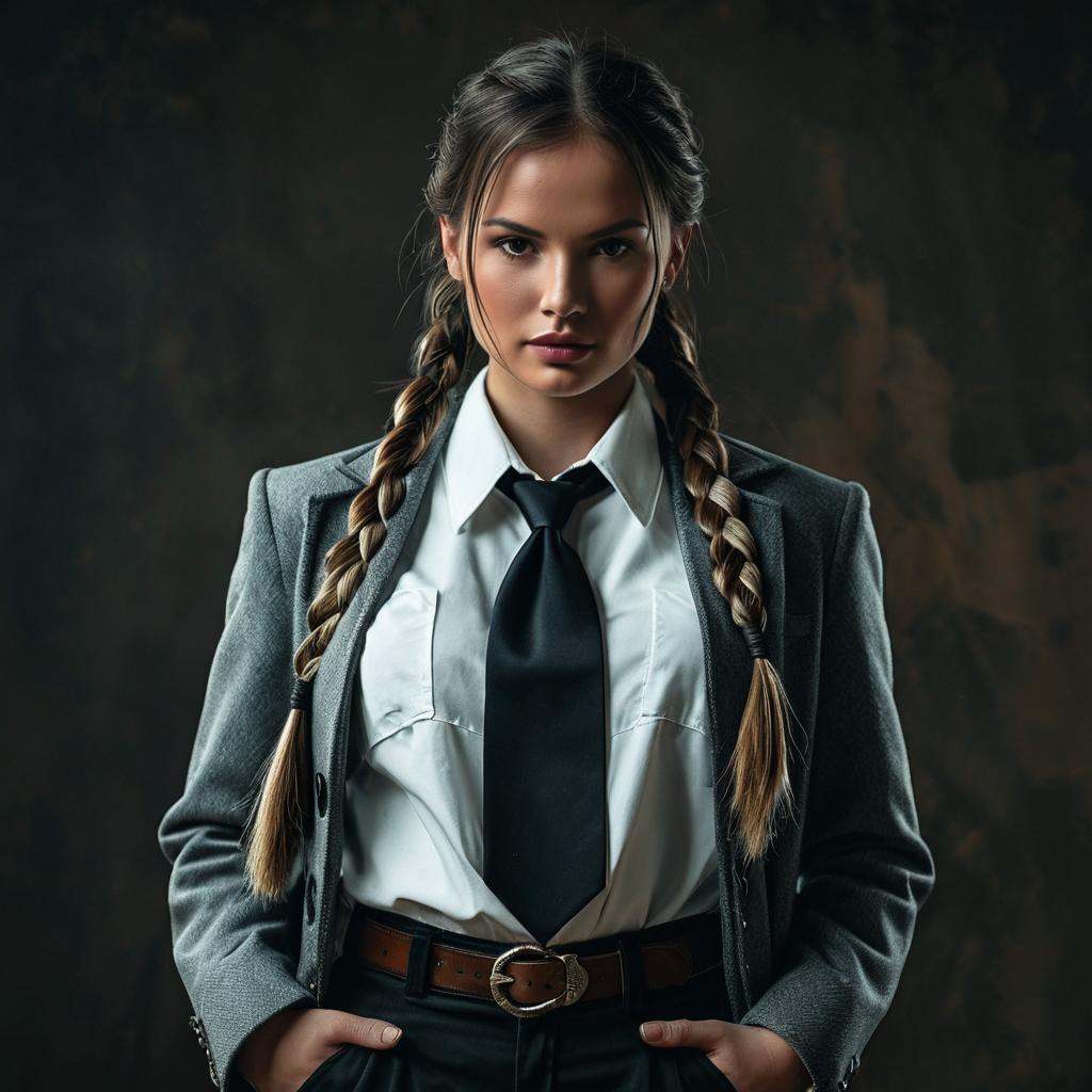 Photograph of a young woman with fair skin and dark brown hair in two braids, wearing a gray blazer over a white dress shirt, black tie, and black pants with a brown belt. Her hands rest on her hips, and she has a serious, focused expression. The background is dark and textured, creating a dramatic contrast with her brightly lit face and clothing. The lighting highlights her sharp features and the texture of her blazer, giving the image a professional and intense atmosphere. The overall style is realistic with a cinematic quality.