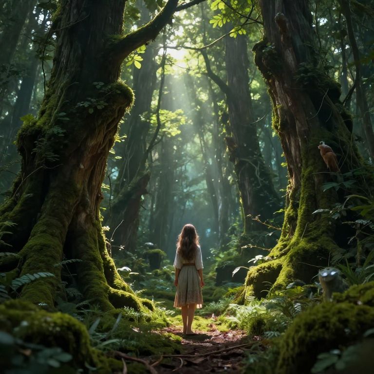 Inez exploring an ancient enchanted forest, shafts of sunlight piercing through dense emerald foliage, moss-covered trees surrounding her, mystical creatures peeking from behind branches, high detail fantasy artwork with rich textures and magical mood