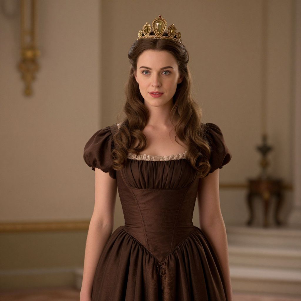 Mia From Princess Diaries Costume, woman in a brown dress and a crown poses for a picture