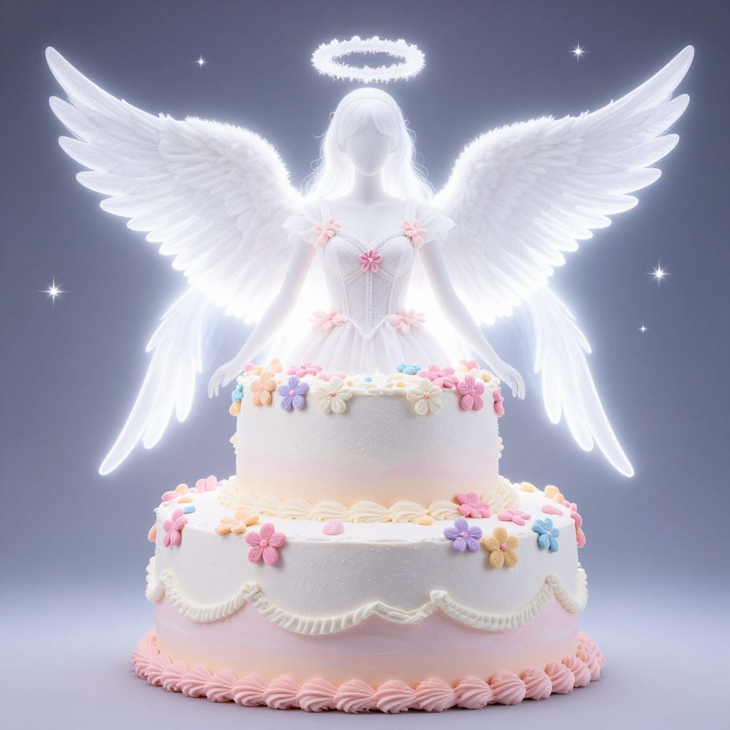 Photorealistic digital image of an angelic figure with white wings and halo, standing on a two-tiered, white and yellow frosted cake,