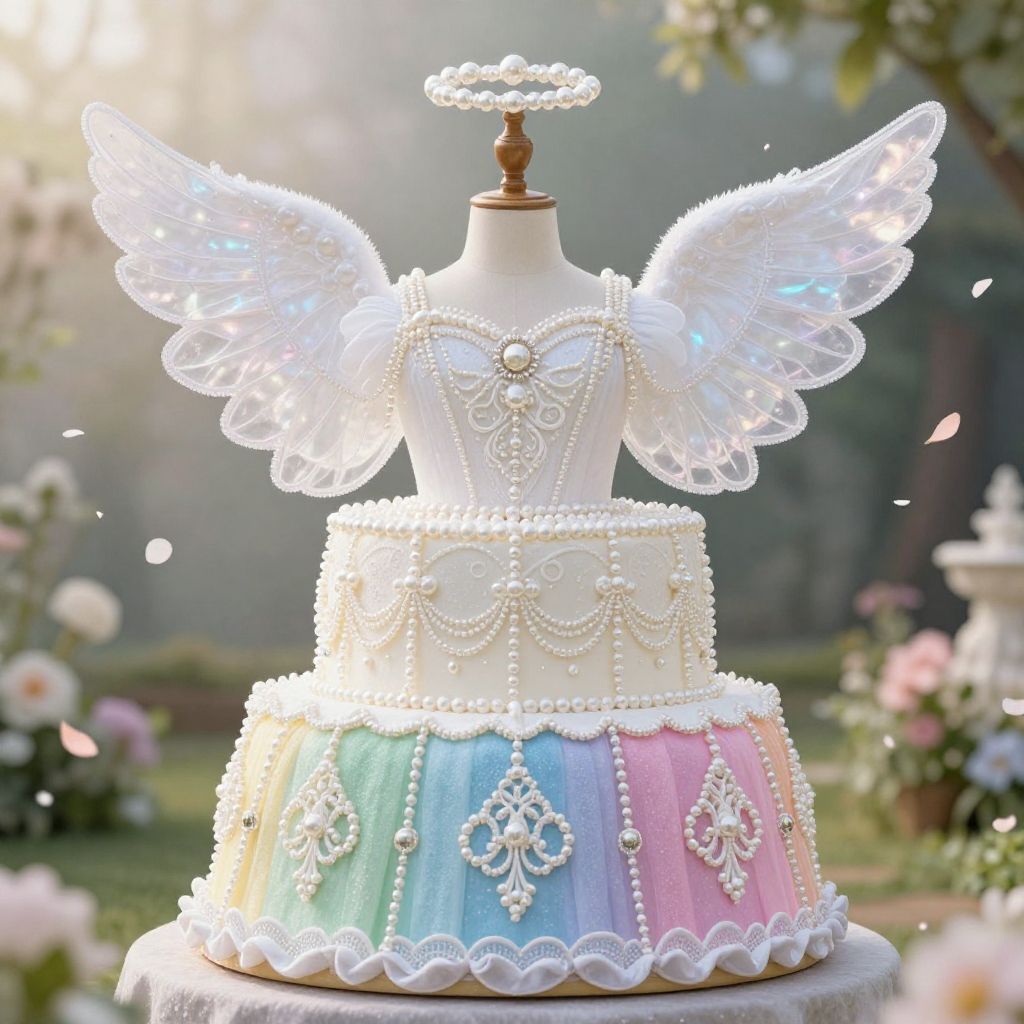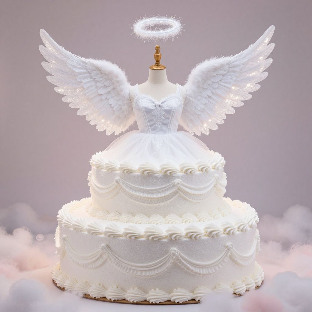 Angel cake costume, a detailed depiction of a person wearing a sculpted costume resembling a frosted cake layered with angelic motifs, feathered wings, and a luminous halo, set in a mystical setting with soft clouds and shimmering lights enhancing the divine look.
