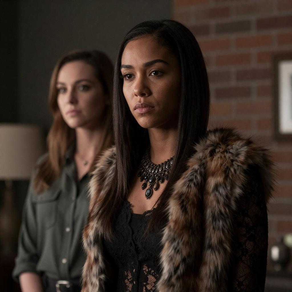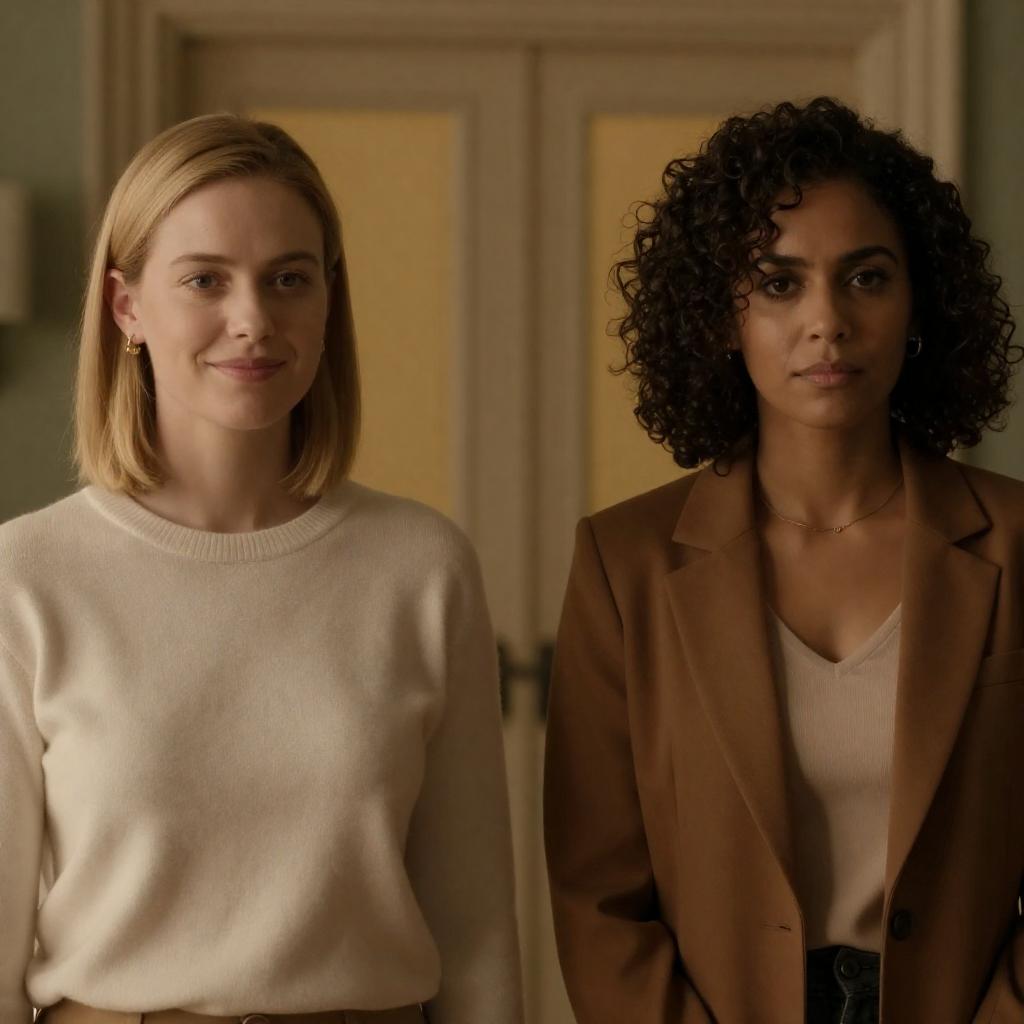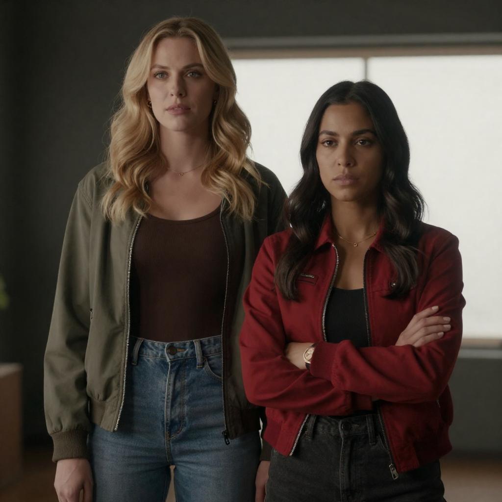 Photograph of two women in a dimly lit room. The blonde woman with wavy hair, wearing a brown top and blue jeans, stands behind a man in a green jacket. The brunette woman with long hair, in a red jacket and dark jeans, stands in front, arms crossed. Bright light from the background highlights their faces.