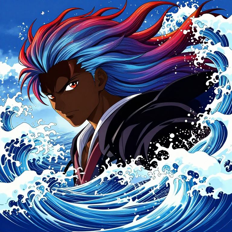 This digital anime-style illustration features a dark-skinned male character with striking, multicolored hair in shades of blue, red, and purple, flowing dynamically. His intense, red-eyed gaze is focused forward. He wears a black jacket with a white collar. The background is a vivid blue sky with white, swirling ocean waves, creating a sense of motion and energy. The character is partially submerged in the waves, with water splashing around him, adding to the dynamic composition. The image has a bold, vibrant color palette and sharp, detailed lines typical of modern digital anime art.