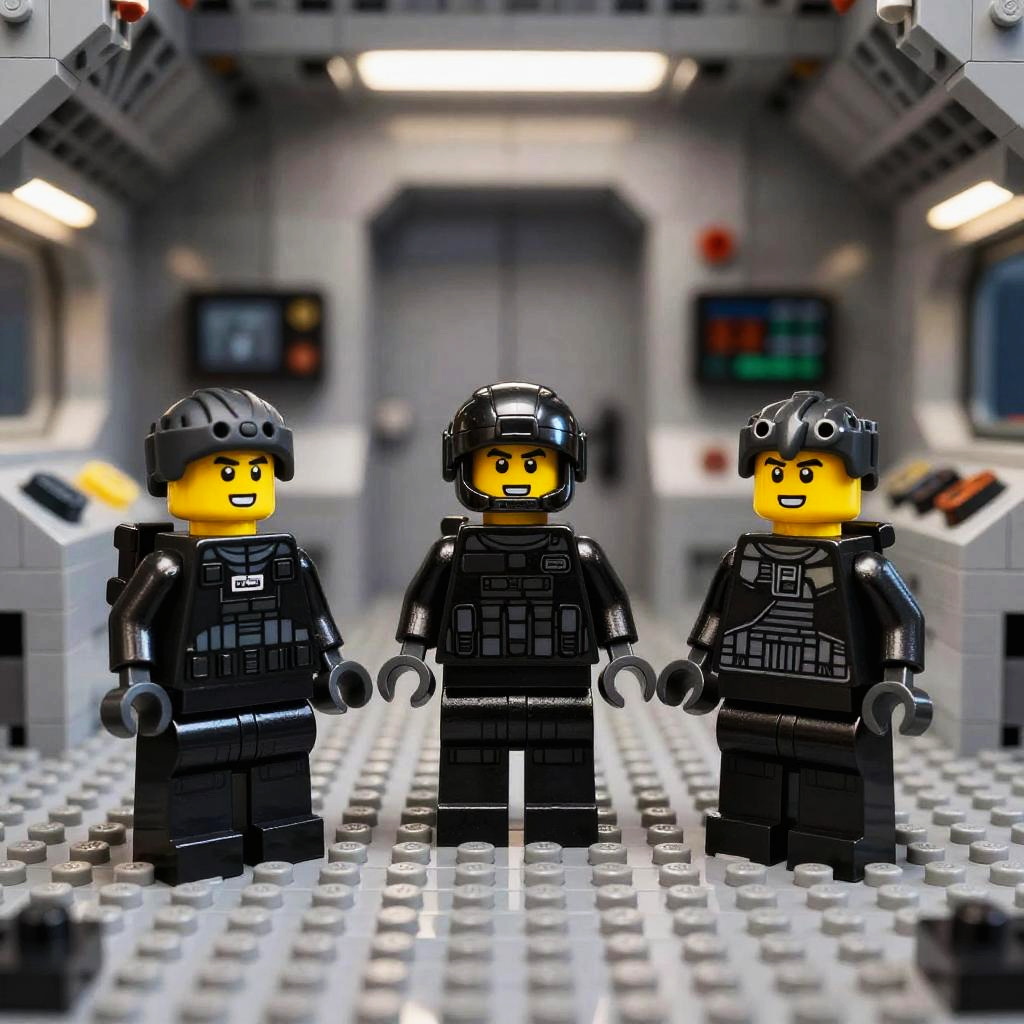 Lego men in black tactical armor, posed ready for action in a dynamic standoff inside a sleek spaceship interior, bright control panels and intricate Lego brick textures, high contrast lighting, dramatic depth of field