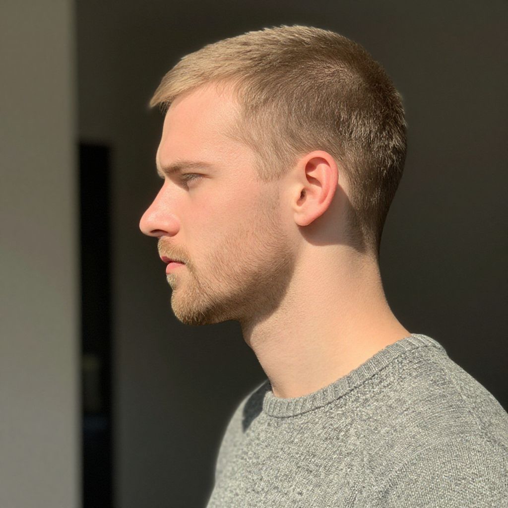Side profile of a young man with a short blonde beard, soft shadows highlighting the contours of his beard and jawline, natural daylight ambiance, wearing a textured wool sweater, photorealistic with subtle artistic enhancements.