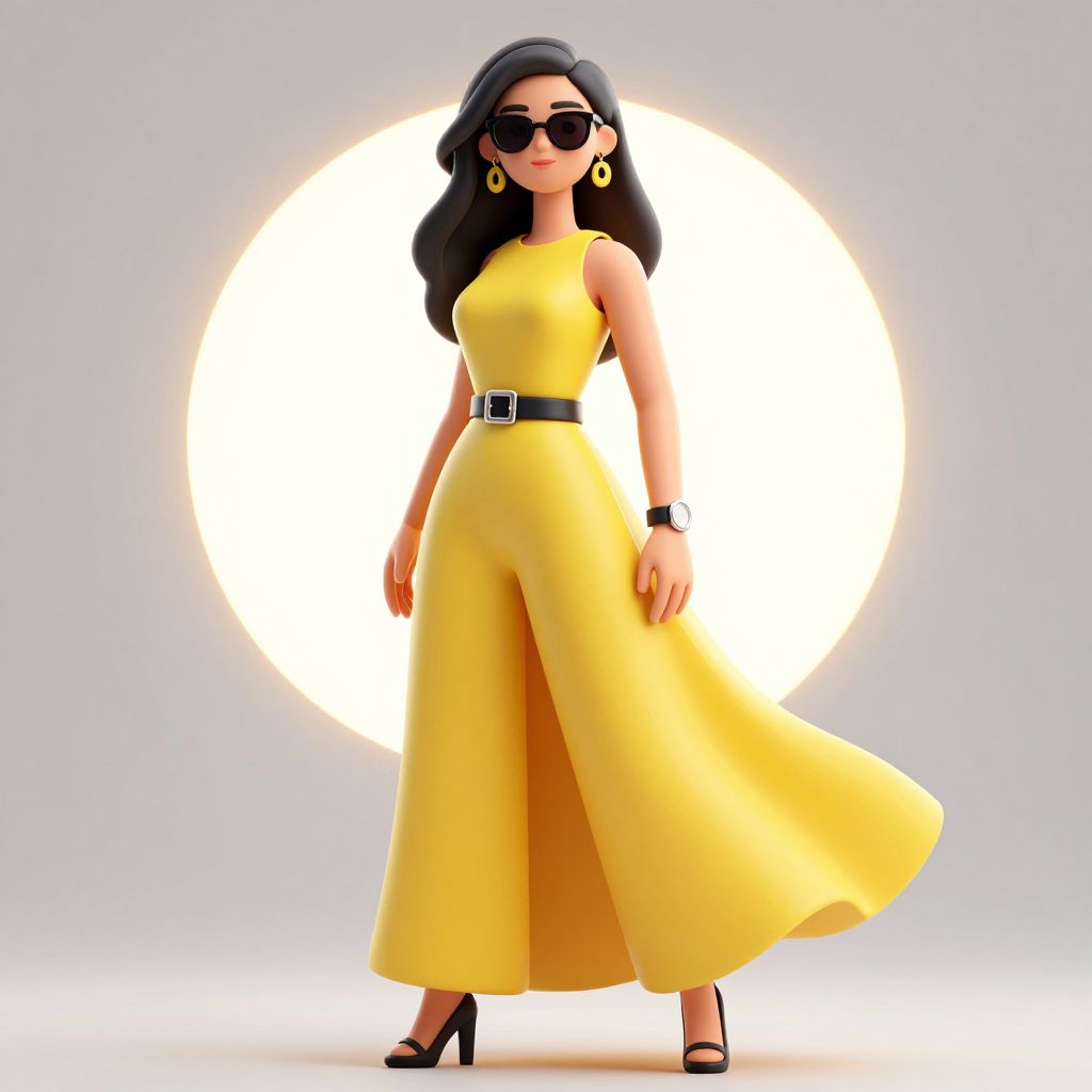 This is a digital 3D rendering of a stylish woman standing in front of a glowing circular light. She has long, wavy black hair and wears large, dark sunglasses. Her outfit is a sleeveless, bright yellow, high-waisted maxi dress with a black belt, and black high-heeled sandals. She accessorizes with large yellow hoop earrings and a black wristwatch. The background is a simple, light gray, with the circular light creating a bright halo effect behind her. The image has a modern, chic, and fashionable vibe.