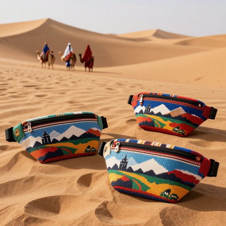 Trendy fanny packs woven into a colorful desert landscape, sand dunes, nomadic tribes, traditional meets modern, desert fashion, bold patterns, warm golden hour sun