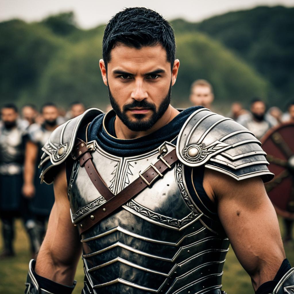 Gladiator adult costume,1boy, male focus, armor, facial hair, solo, beard, looking at viewer, black hair, breastplate, shoulder armor, short hair, muscular, blurry background, pauldrons, blurry, mustache