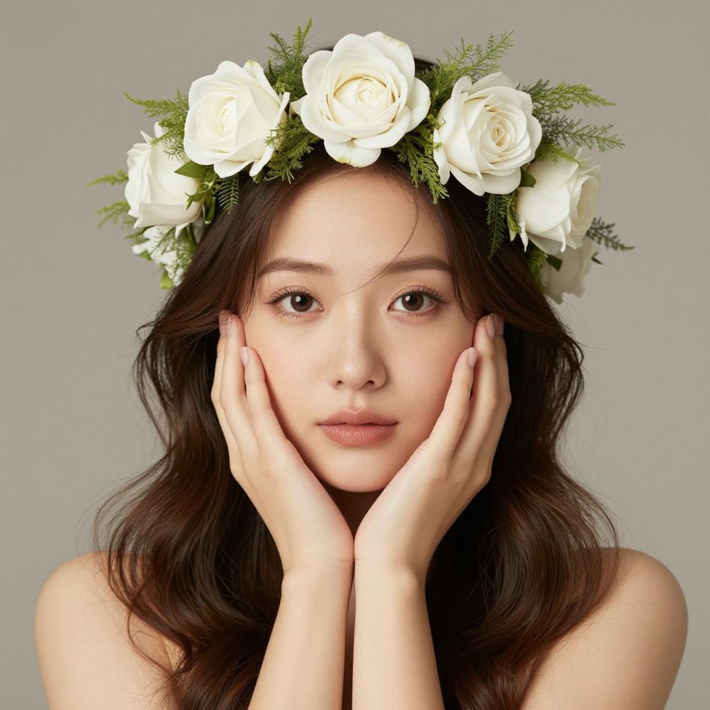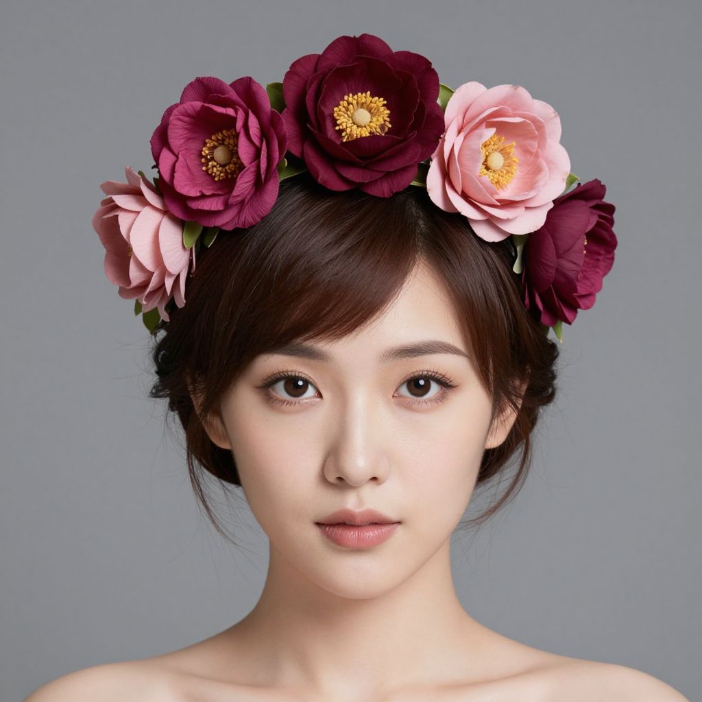 Photograph of an Asian woman with fair skin, dark brown hair, wearing a floral headpiece with dark red and pink flowers, against a gray background