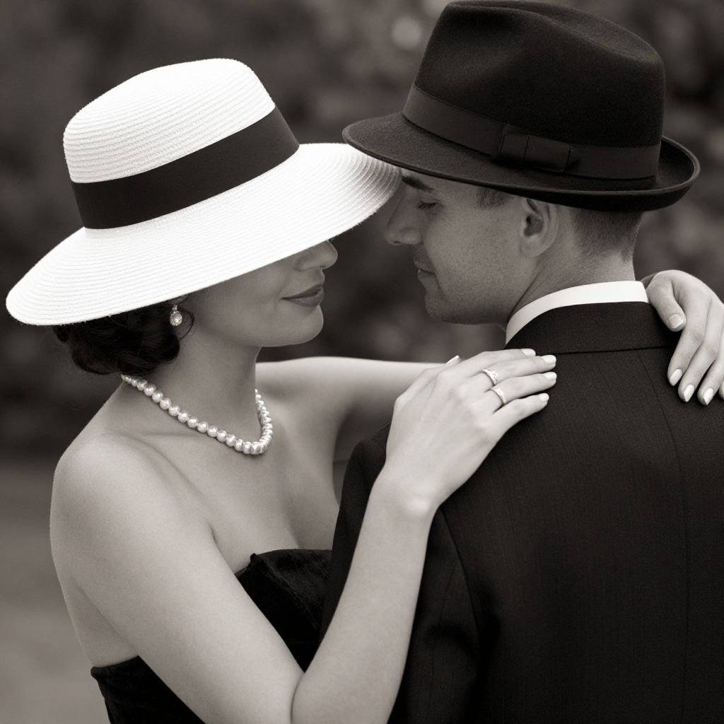 Black-and-white photograph of a couple in vintage attire; woman in pearl necklace and wide-brimmed hat, man in suit and fedora, embracing