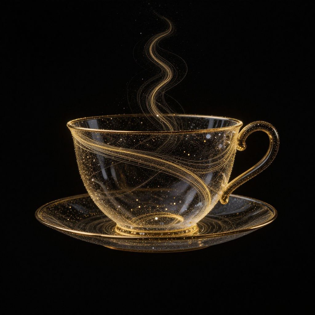 In a cosmic ballet of serenity and wonder, a teacup-shaped vessel drifts through the void, its golden trails of stardust weaving a narrative of timeless elegance and celestial longing, where each particle whispers tales of infinite possibility and the quiet beauty of solitude.