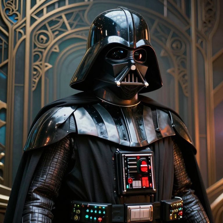 Photorealistic digital image of Darth Vader in his iconic black armor and helmet, standing in a dimly lit, ornate room.
