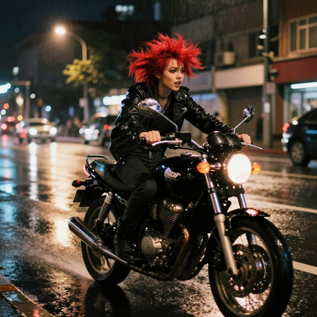 Red and black emo hair flowing dynamically as the subject rides a motorcycle through rain-soaked city streets at night, illuminated by street lamps and reflecting puddles, evoking a sense of freedom and intense emotional expression.