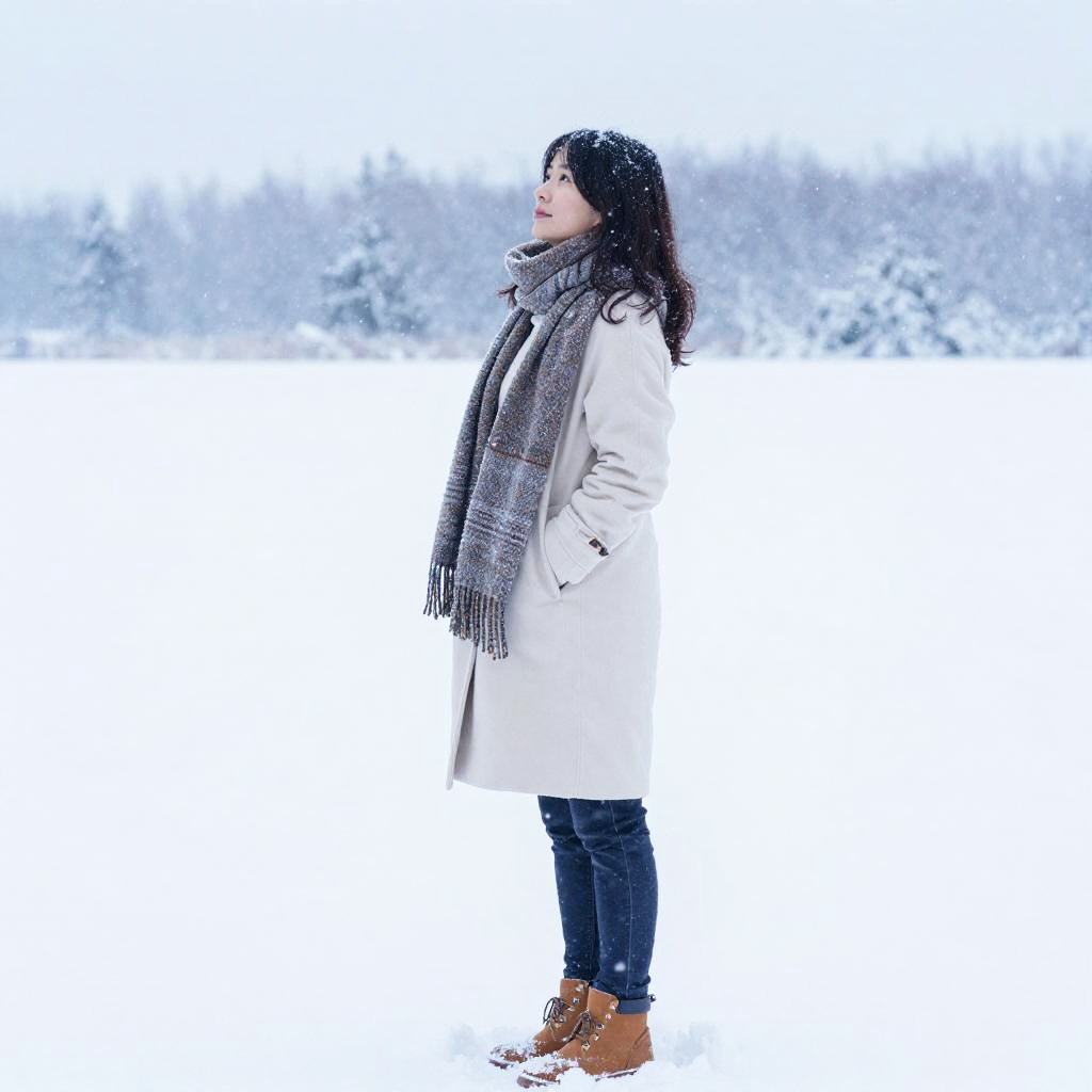 Realistic photo.Female figure in snow, snowflakes gently falling, soft white snow covering the landscape, winter ambiance, tranquil and serene atmosphere, cool tones with hints of blue, the woman dressed in a cozy scarf and boots, standing amid a snowy expanse, 4K ultra-detailed, capturing the essence of winter tranquility and the beauty of nature's wintry touch realistic photo