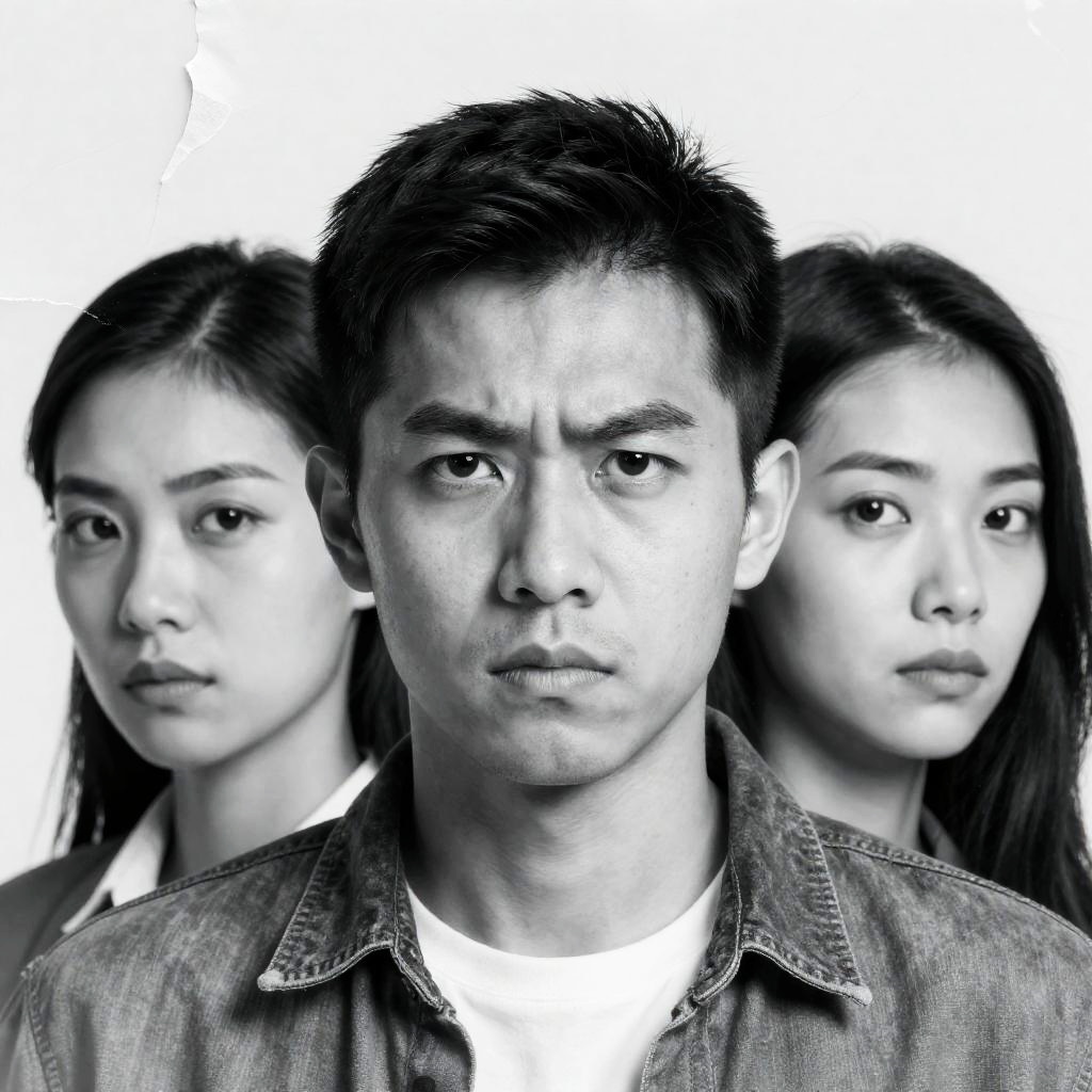 Photograph of three people with intense expressions. Leftmost man with dark hair, serious look. Center man with darker skin, stern expression. Rightmost woman with white face paint, red eyeshadow, neutral expression. Blue and black stained shirts. Dark background.