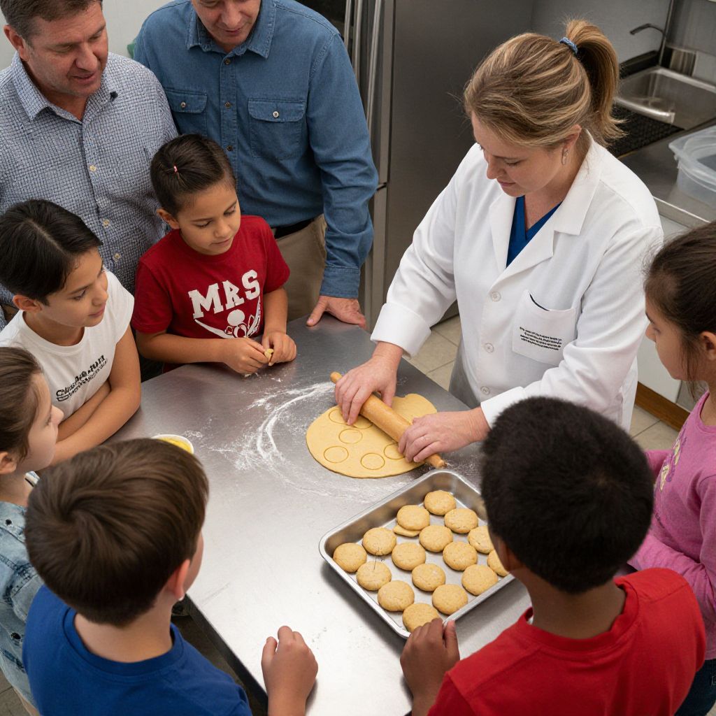 Children and adults gather around a stainless steel countertop in a kitchen, observing as a woman in a white lab coat rolls out dough and cuts out circular shapes, demonstrating the process of making Mrs. Hanes Moravian Cookies in Clemmons, North Carolina.