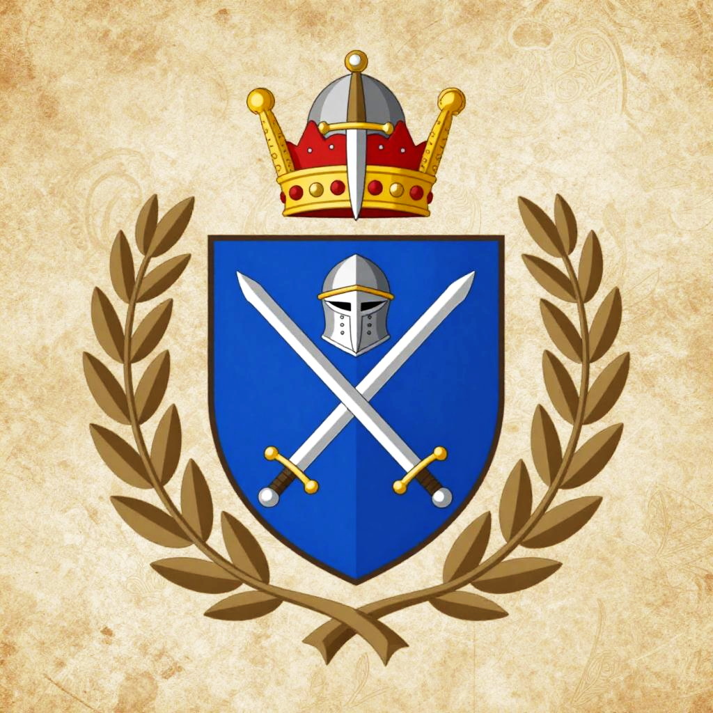 Heraldry generator for a noble family crest, blending traditional medieval symbols like swords, helmets, and laurel wreaths, warm earthy tones contrasted with royal blue, symmetrical layout with heraldic mantling, art nouveau influences on a parchment texture background.