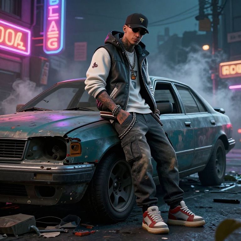 Fortnite thug leaning against a wrecked car in a dystopian urban street, gritty atmosphere with smoke and neon signs, emphasizing tough and stylish demeanor