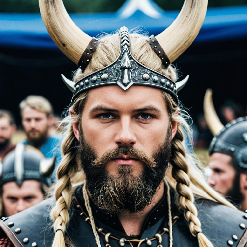 Viking festival,facial hair, male focus, beard, horns, pointy ears, 1boy, solo focus, braid, fake horns, long hair, helmet, blurry background, looking at viewer, blurry, blue eyes, blonde hair