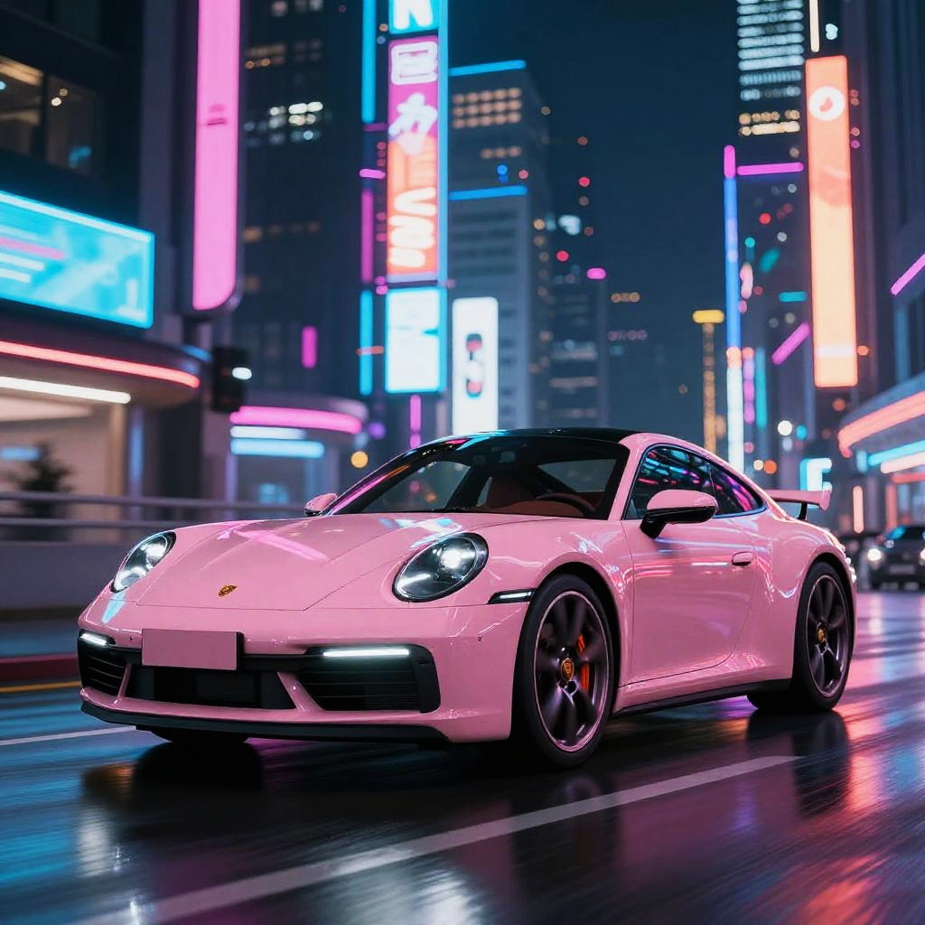 Porsche 911 baby pink cruising through a neon-lit cyberpunk city at night, reflections of colorful lights on the car's surface, dark wet streets with glowing signage, high contrast and vivid colors, cinematic atmosphere with a futuristic twist