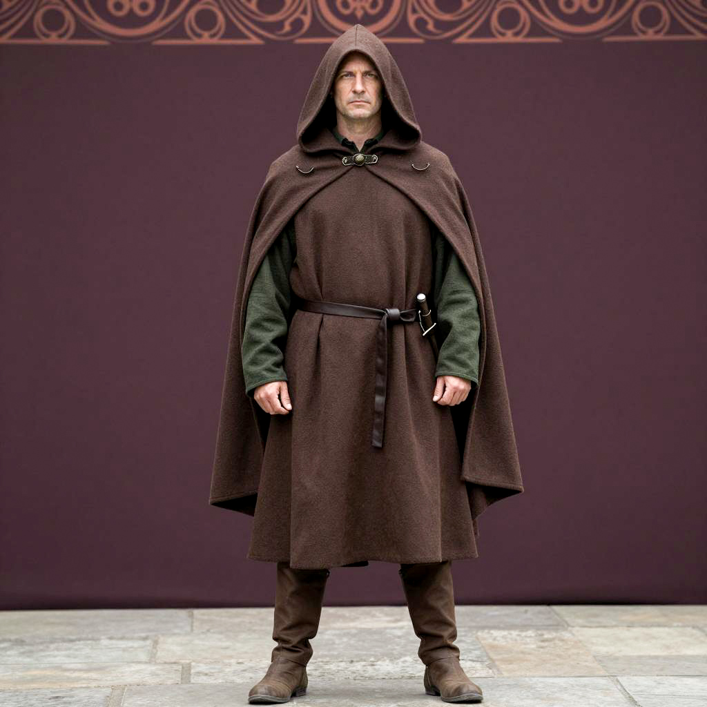 Blue velvet costume, photorealistic, full body, male, standing, wearing blue medieval wizard robe, hood up, silver gloves, ornate belt, boots, dark red and gold patterned background, rich ures, detailed lighting, dramatic shadows, fantasy character, centered, realistic colors, high contrast, serious expression, medieval fantasy aesthetic
