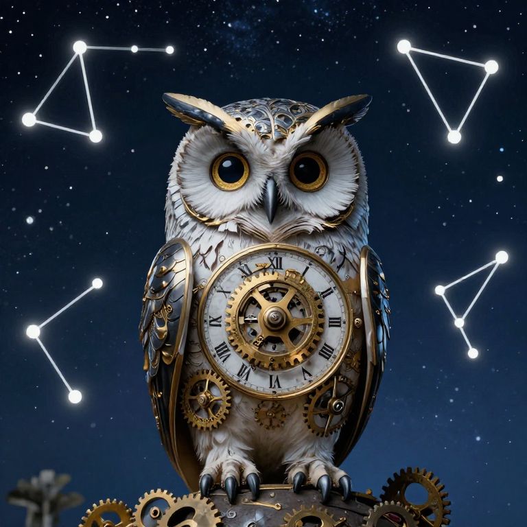 Amidst the celestial dance of forgotten constellations, a clockwork owl, its gears whispering secrets of time, stands as a guardian of nocturnal mysteries, embodying the eternal quest for order amidst the infinite expanse of the universe.