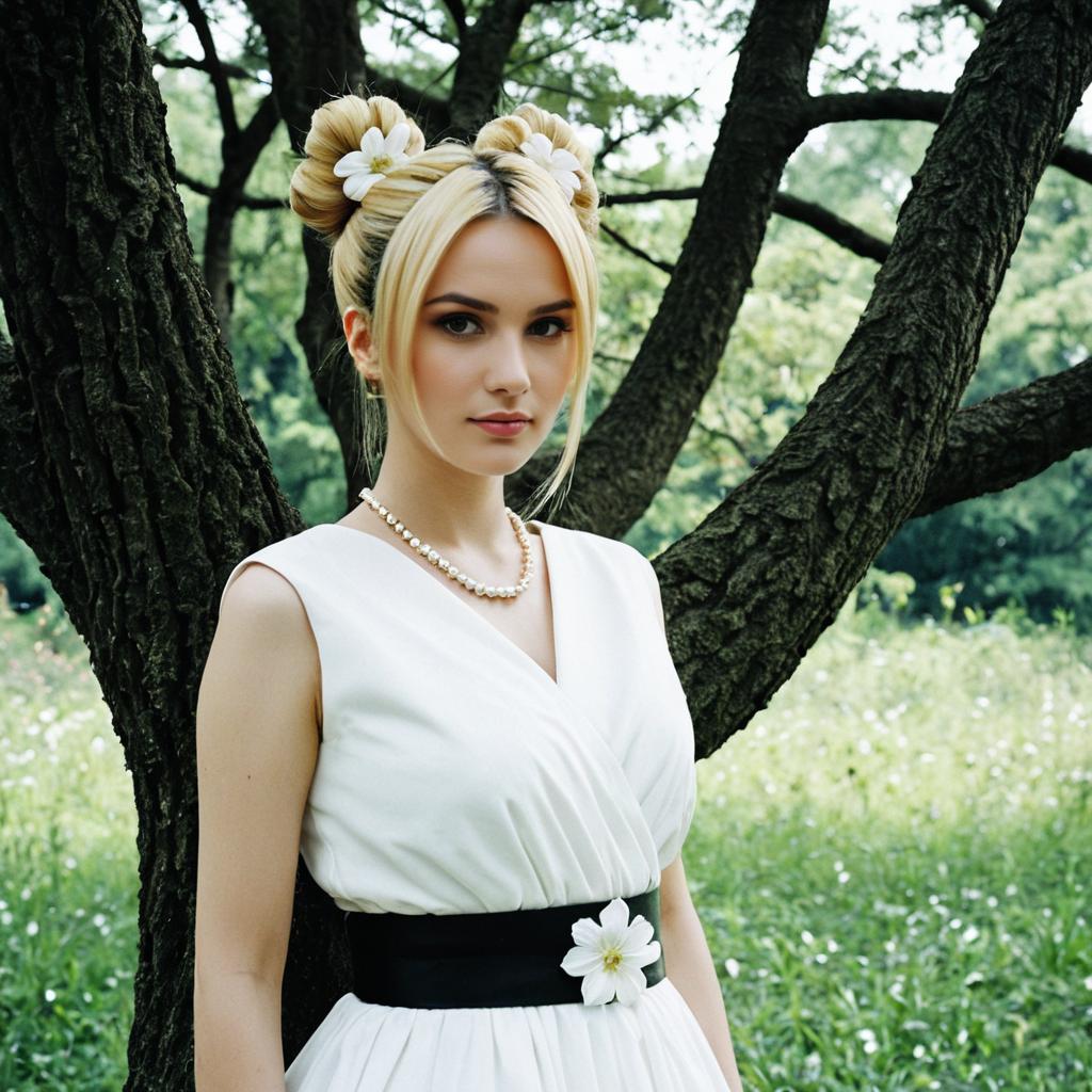 Erome cosplay,1girl, solo, blonde hair, dress, long hair, tree, hair ornament, outdoors, white dress, hair flower, looking at viewer, flower, standing, bare shoulders, blurry background, blurry