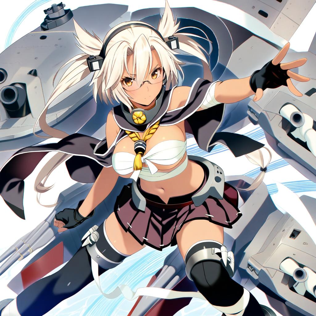 Musashi kai (kancolle), kantai collection, 1girl, dark-skinned female, red eyes, hair between eyes, glasses, pointy hair, long hair, blonde hair, white hair, two side up, twintails, large breasts, chest sarashi, navel, black gloves, fingerless gloves, black thighhighs, black skirt, pleated skirt, budget sarashi, headgear, miniskirt, by artist koutaro, animagine