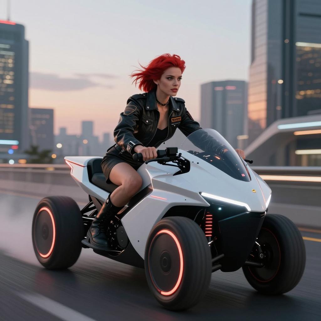 Female pilot with short red hair piloting a sleek neon-lit hoverbike through futuristic cityscape at twilight, fashion photography, glam art, cinematic drama, epic scale, exquisite detail, 30-megapixel 4K, 85 mm lens, sharp focus, f/8, ISO 100, 1/125 s shutter, diffuse back-lighting, award-winning composition.