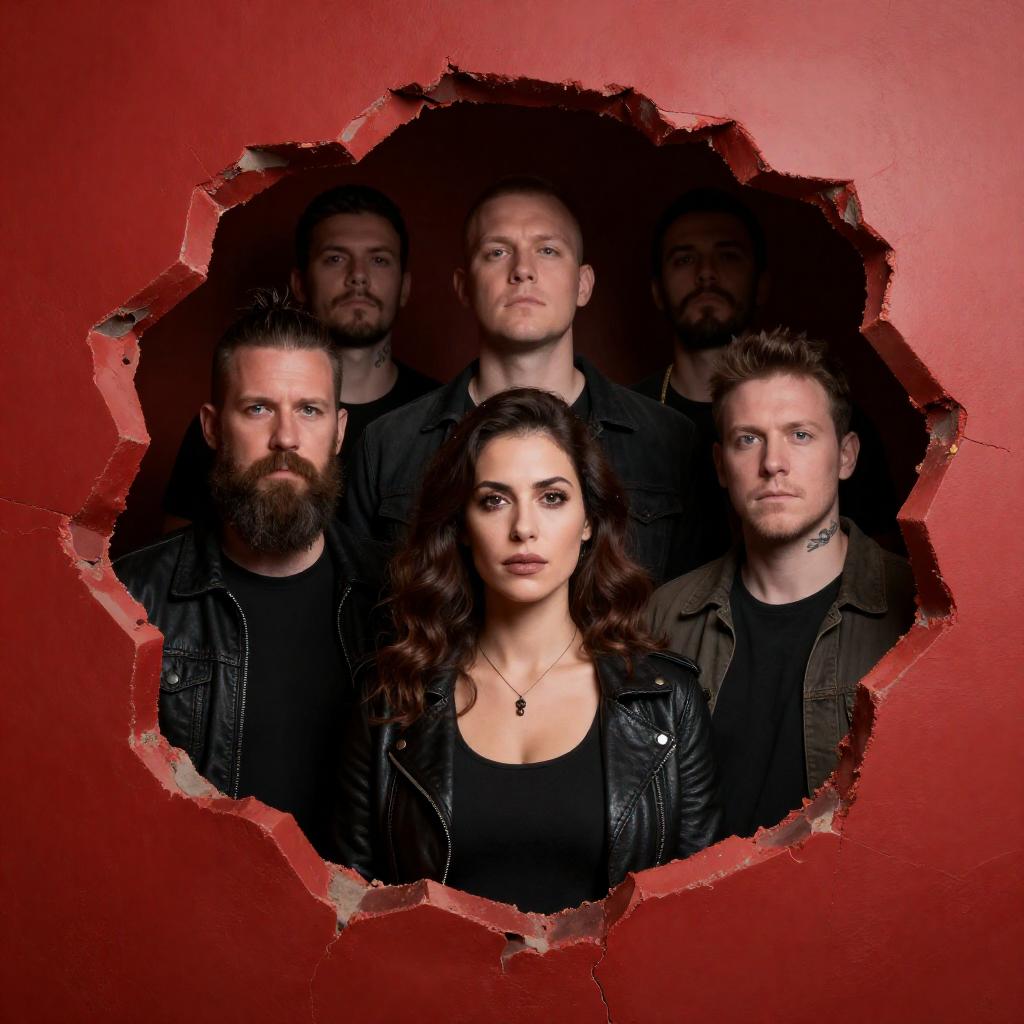 Photograph of six people emerging from a jagged red hole. Five men with intense expressions, one woman with a serious look. Beards, tattoos, and rugged clothing. Red background with rough ure. Group poses in various orientations, some with heads tilted back.