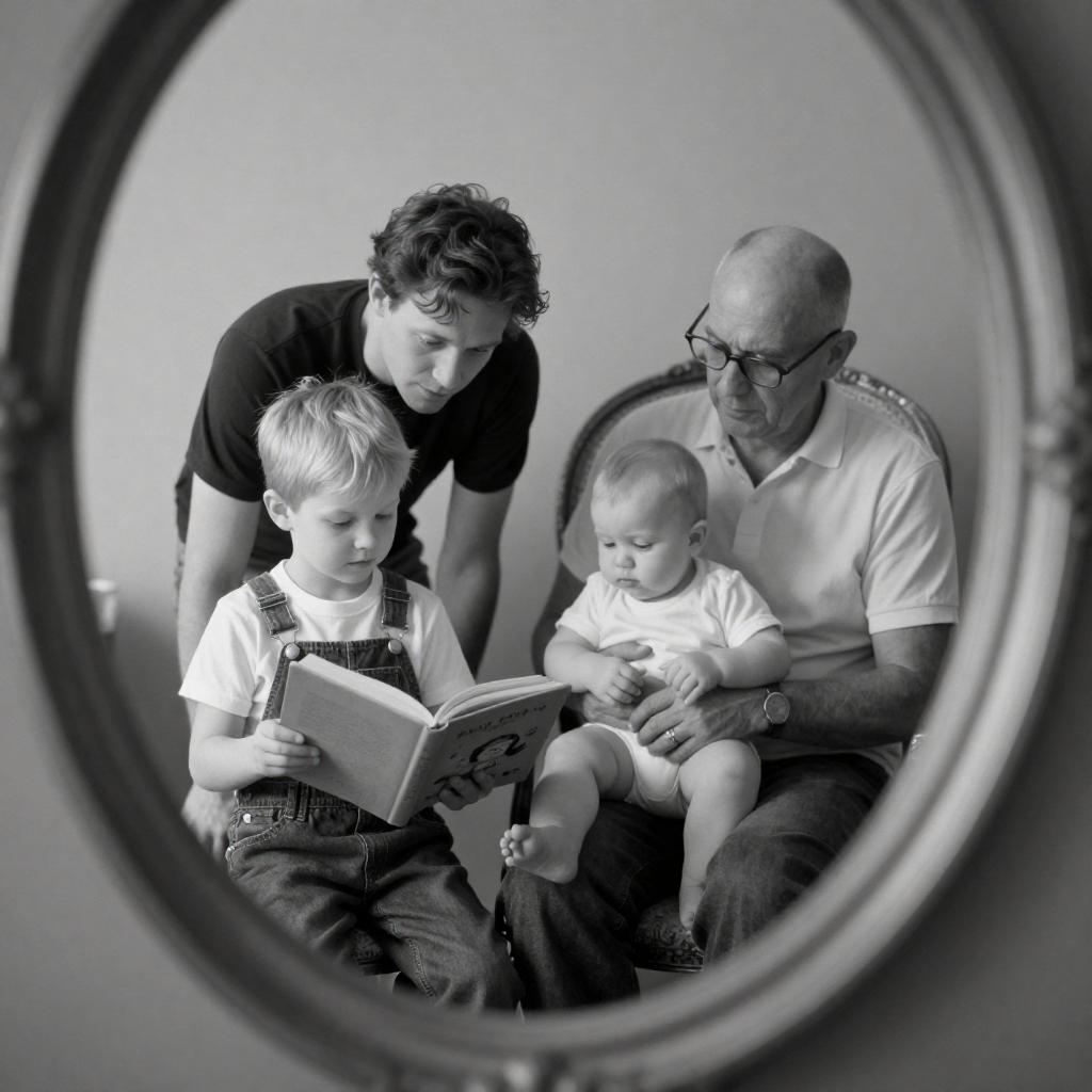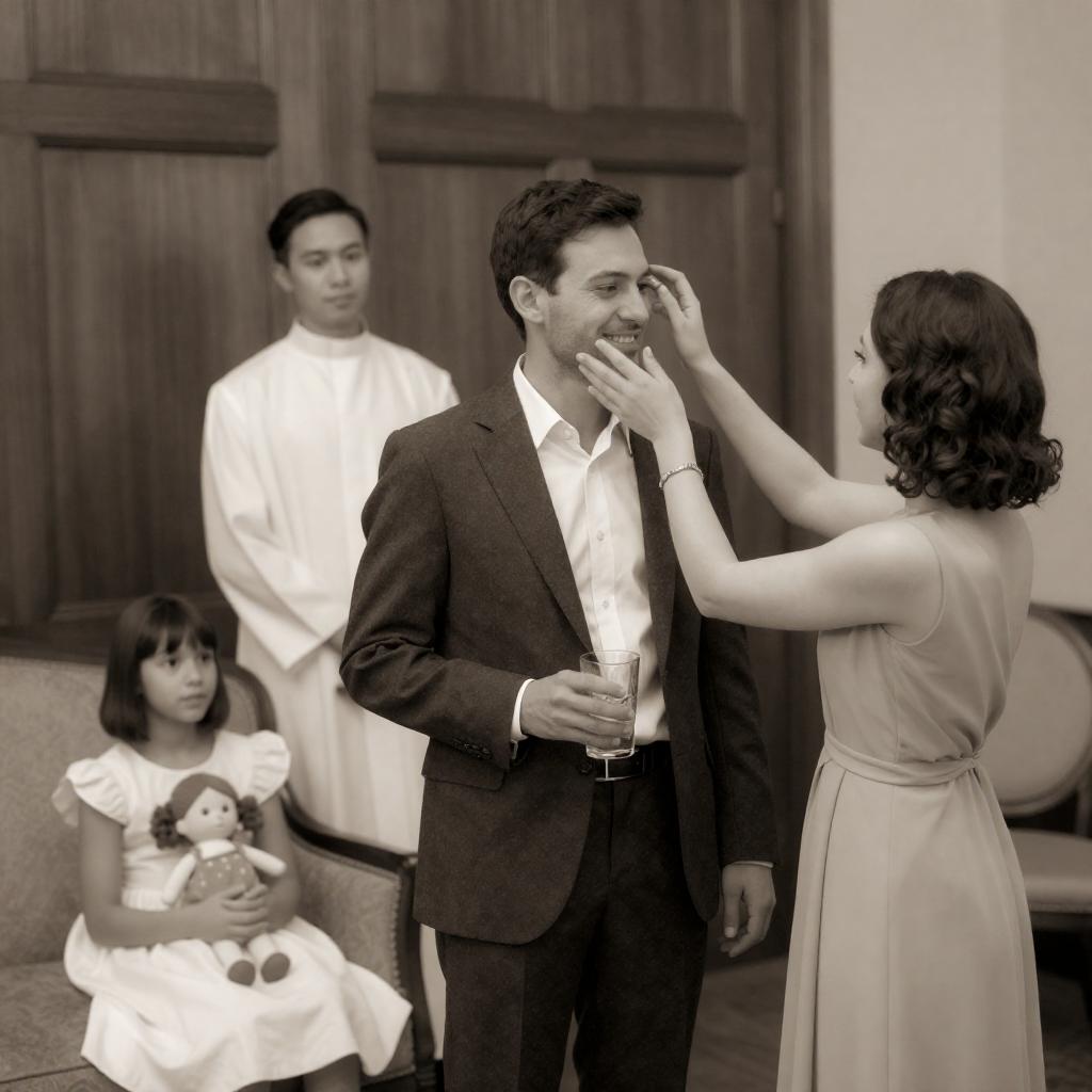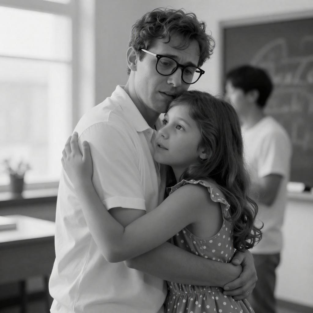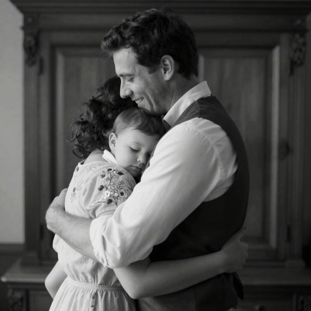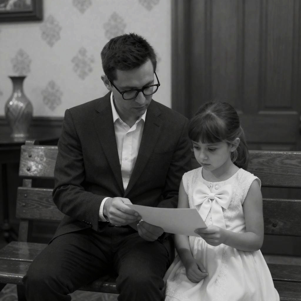 Black-and-white photograph of a man and young girl sitting on a wooden bench. Man in dark suit, glasses, holding object; girl in light dress with large bow, focused on paper. Floral wallpaper, wooden door, table with vase in background. Man's neutral expression, girl's intense focus. Man on left, girl on right.