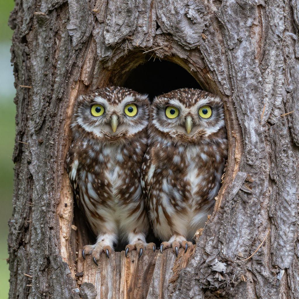 Photograph of two small, brown and white owlets peeking out of a tree cavity. Their big, yellow eyes are wide open, looking directly at the camera. The tree bark is rough and textured, with a mix of gray and brown tones. The background is softly blurred, suggesting an outdoor, natural setting. The owlets' fluffy feathers contrast with the tree's rugged surface, making them stand out.