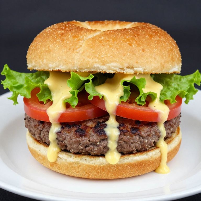 Luscious burger featuring a golden-brown bagel bun, dripping with creamy yellow sauce, layered with fresh lettuce, vibrant tomato slices, and a juicy patty, served on a pristine white plate.