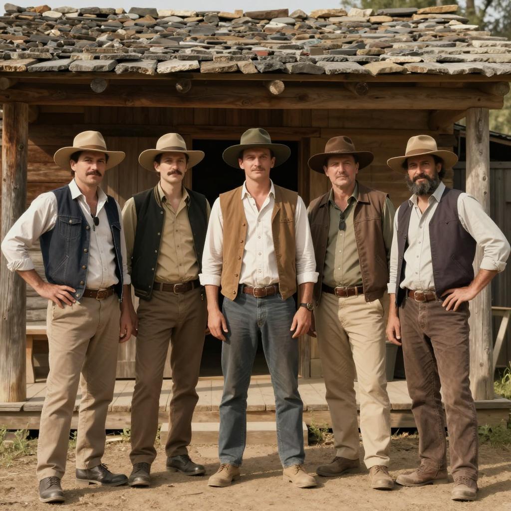 Group photograph of six men in Western attire standing in front of a wooden shack. They wear hats, vests, jackets, and belts. Five men have mustaches, one has a beard. Hands on hips or belts. Wooden shack with stone roof in background. Sunlit, outdoor setting. Five men in center, one on left, one on right. Casual, relaxed poses.