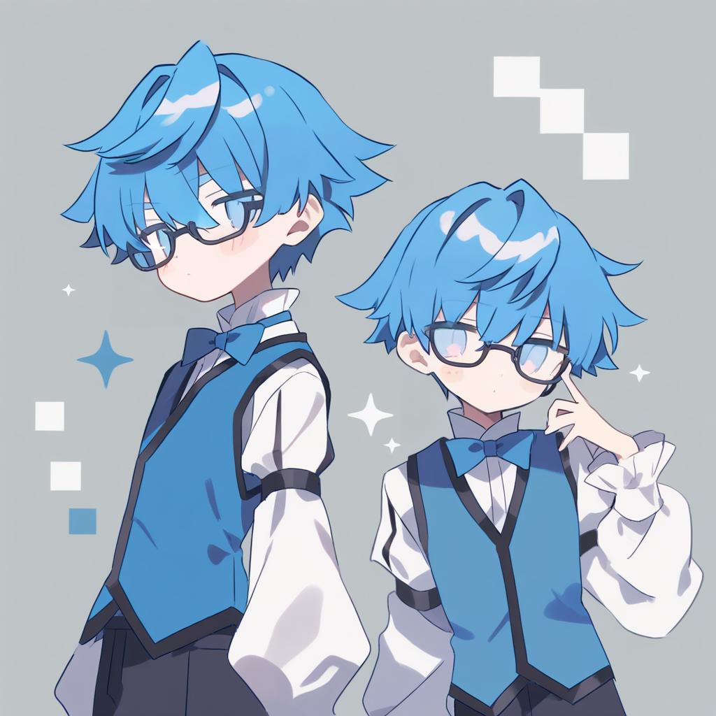 Hans christian andersen (fate), fate (series), 1boy, blue eyes, glasses, blue hair, short hair, vest, long sleeves, bowtie, by artist negresco, illustrious