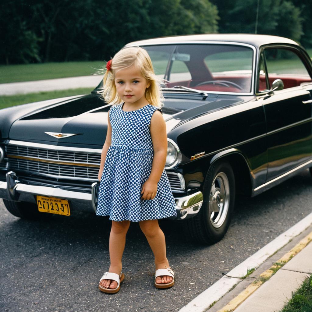 A blonde toddler girl with light skin stands on a street next to a black vintage car. She is wearing a blue and white polka dot sleeveless dress, white sandals, and has a red hair clip on her left side. The car, a classic model with chrome detailing and a white roof, is parked on the side of the road with greenery in the background.