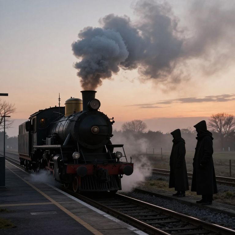 Amidst the hazy embrace of twilight, a steam locomotive exhales a cloud of nostalgia, as figures cloaked in mystery stand poised on the platform, their silhouettes whispering tales of departure and the eternal quest for alternate paths.