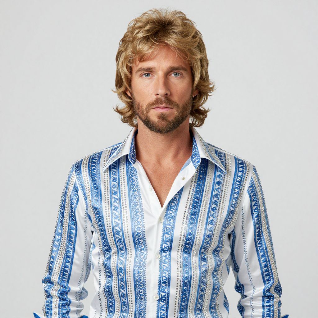 A photorealistic, detailed studio portrait of a man dressed in a classic ABBA-inspired outfit, featuring a white shirt with blue patterned stripes and rhinestone accents. The image highlights his blonde hair and beard, capturing the iconic 1970s disco style and fashion through high-quality cosplay photography.