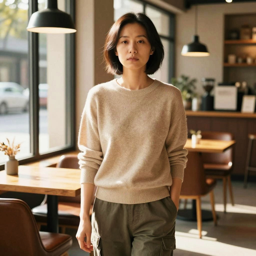 Editorial portrait of a focused middle-aged Asian woman with short jet-black hair and bold eyebrows, wearing a tailored beige trench coat over a sleek black turtleneck. She stands near a tall window, leaning against a sunlit white wall with her right hand in her pocket. The image is softly illuminated by dim early morning natural light coming from the side, featuring a clean background with shallow depth of field and subtle grain for a refined and authentic expression.