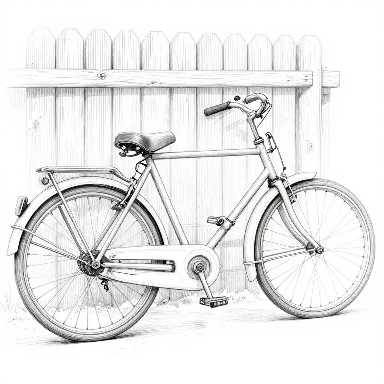 Convert picture to outline sketch of a vintage bicycle leaning against a rustic fence, fine line art highlighting mechanical details and textures, soft cross-hatching providing dimension, evoking a nostalgic and artistic hand-drawn feel.