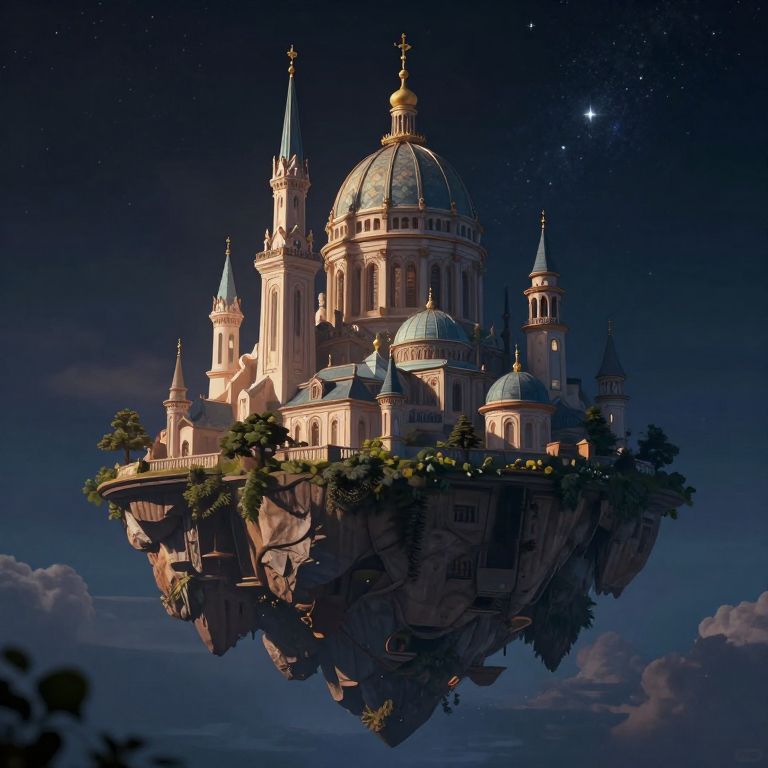 A majestic, computer-generated 3D render depicts a fantastical floating island adorned with steeples and domes, illuminated by dramatic lighting against a starry night sky, evoking a dreamlike, otherworldly atmosphere reminiscent of surrealist art.