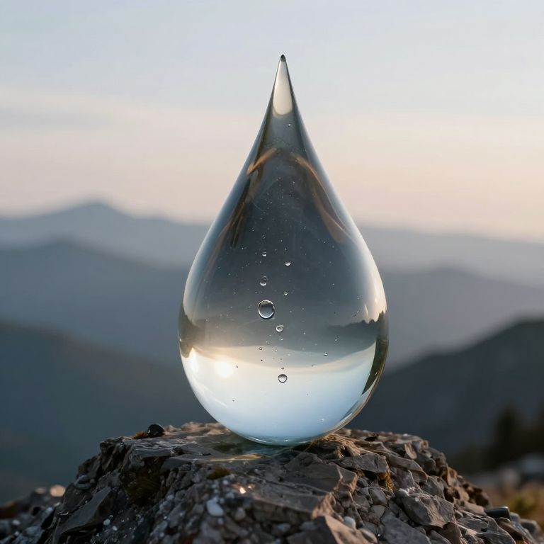 Photograph of a clear glass droplet, resembling a teardrop, perched on a rugged, rocky surface. The droplet is transparent, with small air bubbles suspended inside, reflecting a distant mountainous landscape in the background. The sky is a soft gradient of blue to pink, suggesting either dawn or dusk. The rocks are textured and dark gray, providing a stark contrast to the smooth, reflective glass. The image captures the droplet's delicate balance and the serene, natural setting behind it.