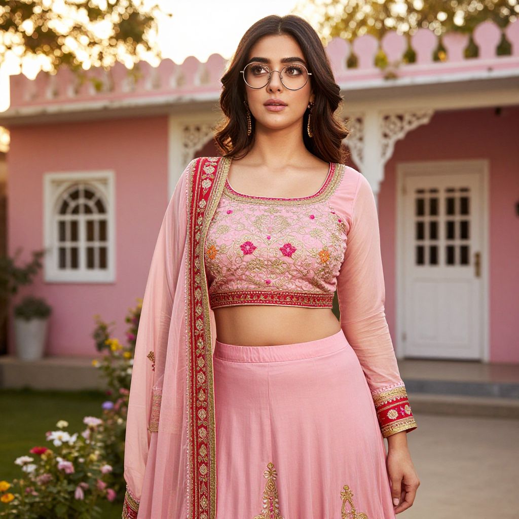 Photograph of a young woman with medium brown skin and long, wavy black hair, wearing round glasses. She's dressed in a light pink traditional Indian outfit with a cropped top adorned with gold embroidery and red floral designs, and a matching full-length skirt. A red and gold border runs along the side of the outfit. She stands in front of a pink building with white trim and arched windows, surrounded by a garden with colorful flowers. The background shows a sunlit, serene outdoor setting. Her expression is calm and confident.