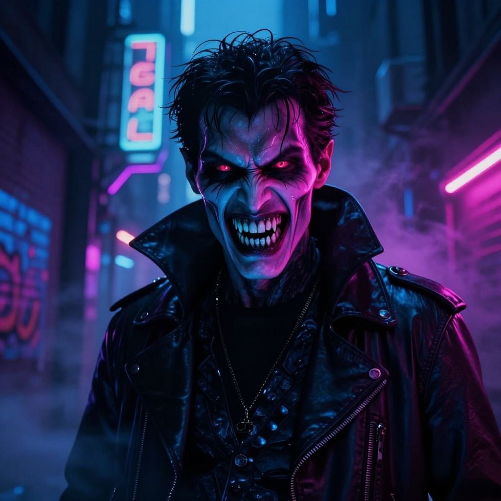 Neon-lit cyberpunk street scene, man with wild hair, glowing pink and blue eyes, sinister grin, black leather jacket, dark makeup,