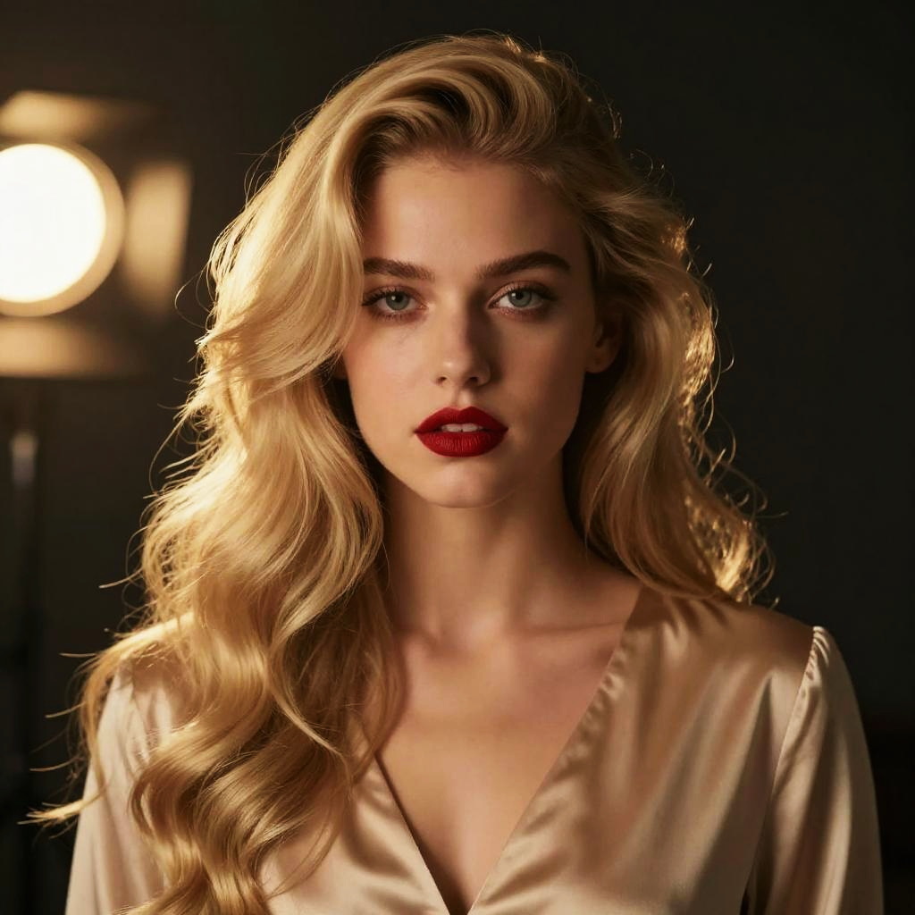 Photorealistic digital portrait of a stunning young woman with long, wavy, golden blonde hair that cascades around her face. She has fair skin, green eyes, and full red lips. She's wearing a silky, beige top that catches the light. The background is dark with a warm, glowing light source on the left, adding a dramatic effect. Her expression is serious and slightly mysterious.