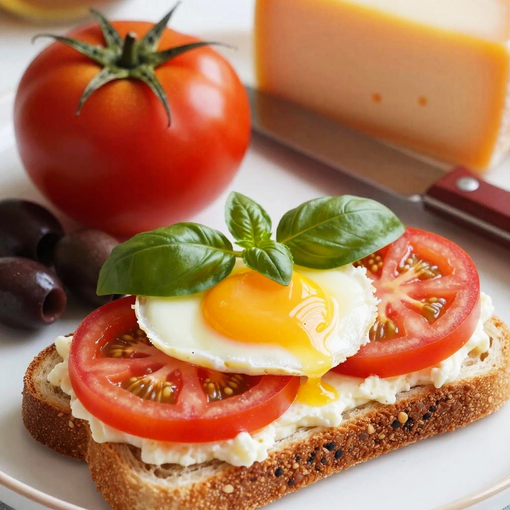 Close-up photo of a colorful breakfast spread. There's a stack of whole grain toast topped with creamy egg yolk, bright red tomato slices, and fresh basil leaves. Behind it, a ripe red tomato and a few dark olives are visible. A shiny knife with a red handle is partially visible, with a yellow-orange cheese in the background. The colors are vibrant and the textures are fresh and appetizing.