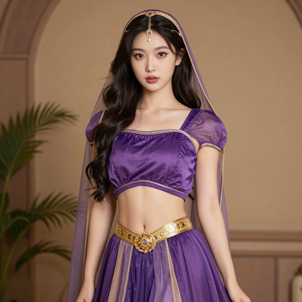 Purple Arabian Princess Costume, wearing a purple dress and a gold belt