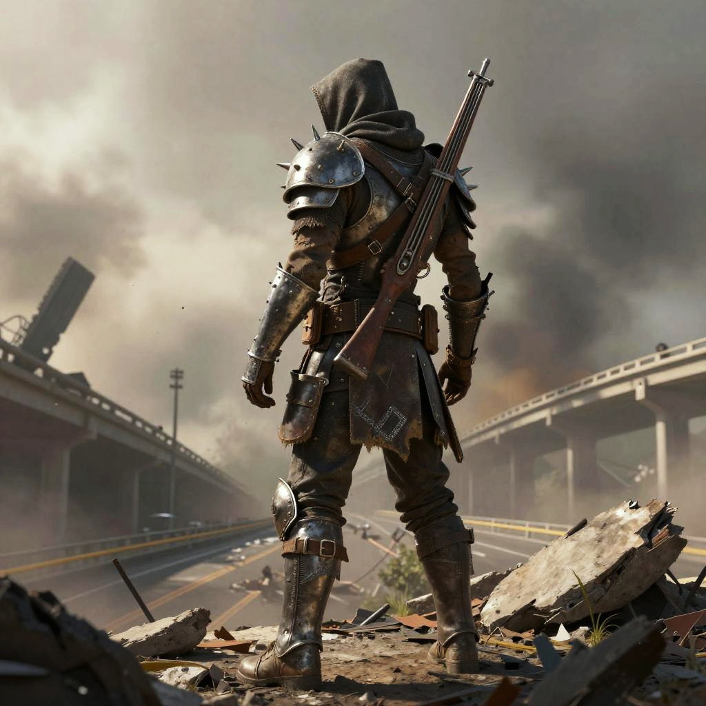 A digital artwork depicts a warrior from behind, standing in a desolate, war-torn landscape. The figure wears dark, heavy armor with spiked shoulder plates and a hood, holding a long rifle over one shoulder. Debris and rubble litter the ground, and a damaged bridge spans the background, with smoke billowing from the distance. The color palette is dark and gritty, with muted grays and browns dominating the scene. The sunlight filters through the smoke, casting a harsh light on the warrior's armor. The overall style is realistic with a dystopian, post-apocalyptic theme.
