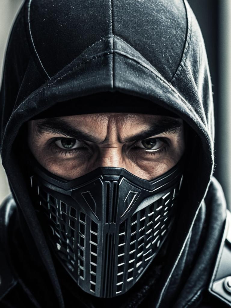 Man in Modern Assassin Costume, close-up detailed headshot, cinematic realism