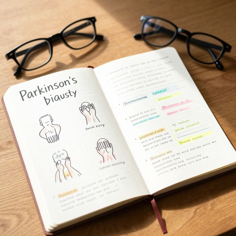 Parkinson's symptom diary concept, open journal with illustrative drawings of tremors and rigidity, colorful annotations, pen and glasses nearby on wooden table, morning light streaming in, capturing daily life and challenges in detail